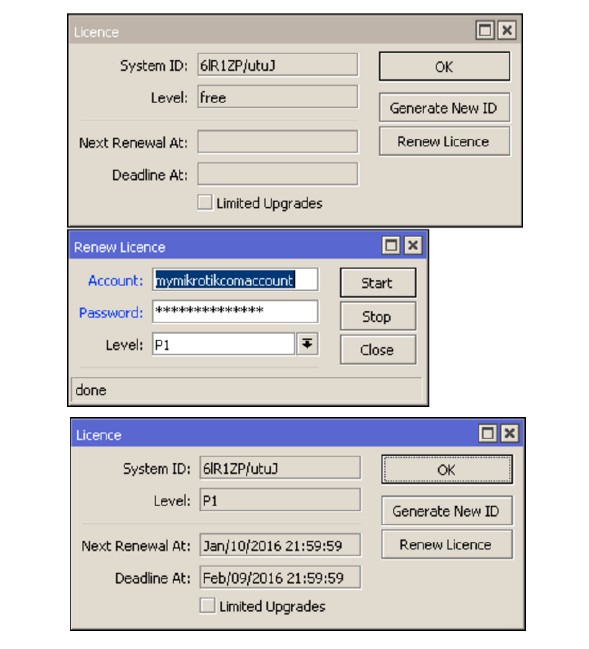 После оплаты счета, заказчику необходимо предоставить нам имя учетной записи зарегистрированной на официальном сайте https://mikrotik.com/на указанный заказчиком аккаунт будет отправлена приобретенная лицензия P1 или P10. Для активации лицензии заказчика необходимо подключиться к маршрутизатору(на веб интерфейс или через Winbox), перейти в меню System – License и нажать на кнопку Renew License, затем в появившемся меню указать аккаунт и пароль зарегистрированной учетной записи, в строке Level необходимо выбрать приобретенную лицензию P1/P10 и нажать Start.