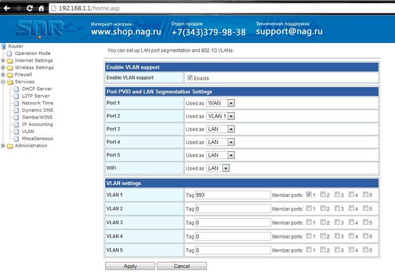 Настройка VLAN на маршрутизаторах SNR-CPE-W4N