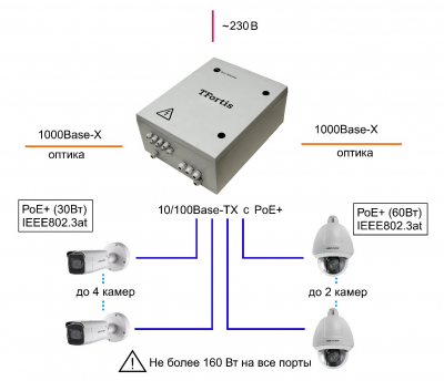 Коммутатор PSW-2G6F+UPS-Box — это многофункциональный гигабитный управляемый коммутатор в уличном исполнении со встроенным источником бесперебойного питания, встроенным оптическим кроссом и поддержкой PoE+, предназначенный для подключения 6-ти видеокамер стандарта PoE+ (IEEE802.3at) две из которых мощностью до 60Вт, а четыре — до 30Вт. Суммарный бюджет мощности PoE — 160Вт.