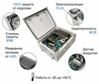 Две аккумуляторные батареи напряжением 12В и емкостью 12А*ч устанавливаются в подогреваемый отсек, внутри которого поддерживается комфортная температура для АКБ даже -60С за бортом.