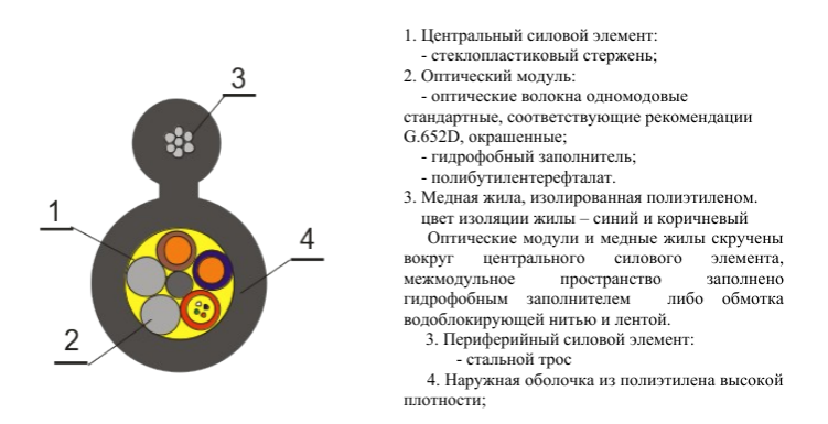 Оптический кабель ОПД представляет собой строение с центральным силовым элементом, оптическими модулями, медными жилами, гидрофобным заполнителем, стальным тросом в наружной оболочке.