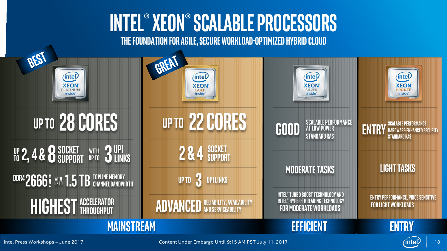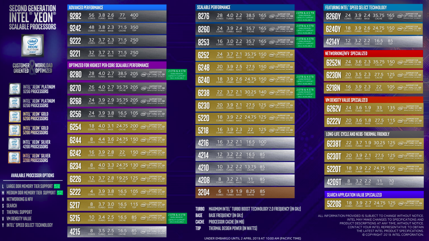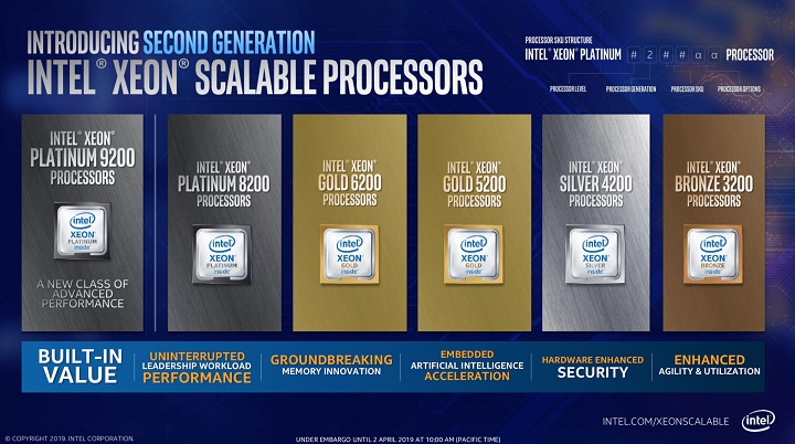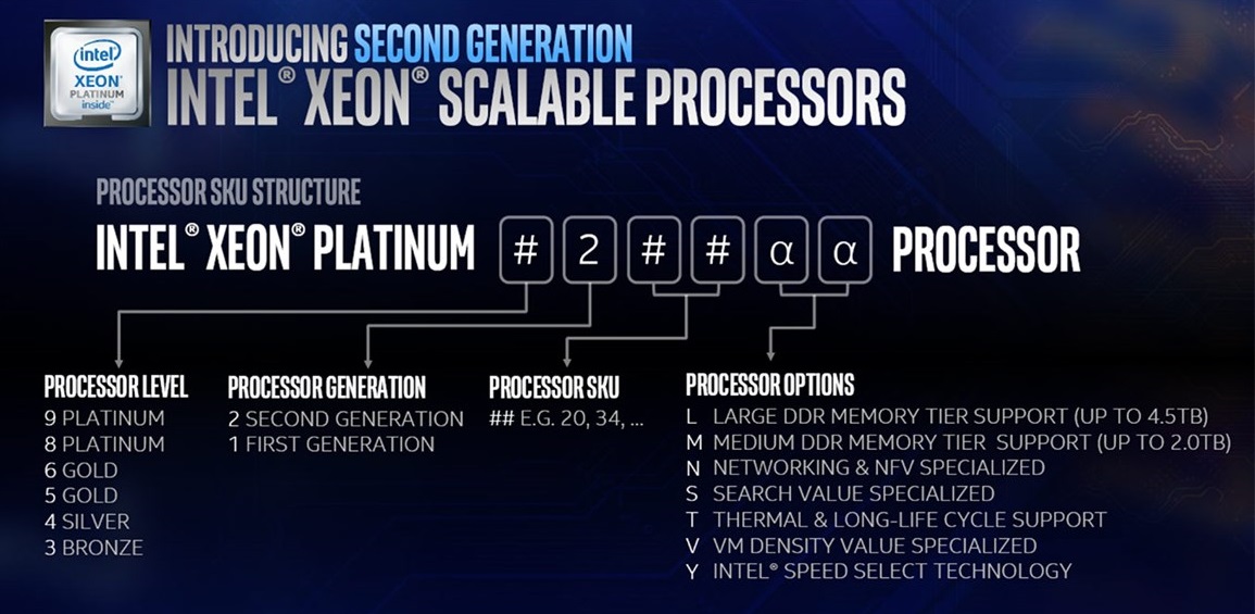 Новые процессоры Intel Xeon семейства Cascade Lake имеют кодовые имена : Platinum, Gold, Silver и Bronze.