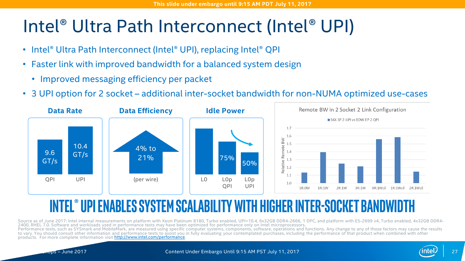 - новая технологии UPI (Ultra Path Interconnect) для более производительной связи между процессорами;