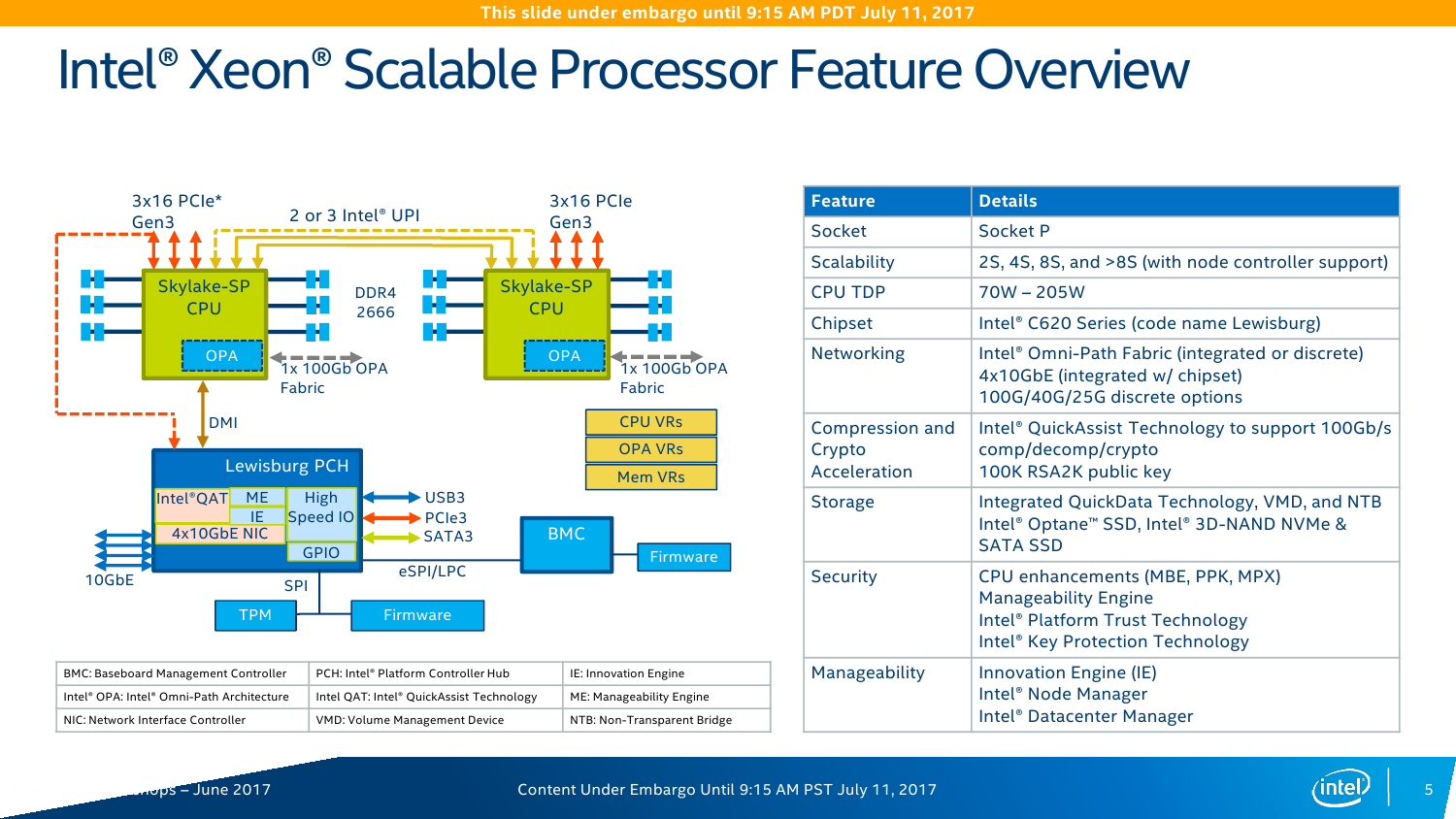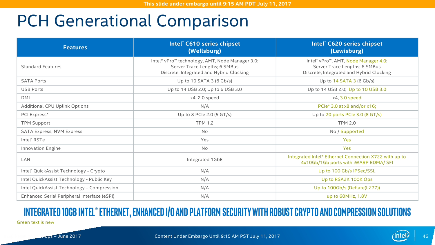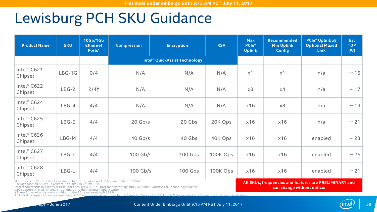 Серия чипсетов C620 включает 7 моделей, которые различаются в первую очередь сетевыми возможностями — набором Ethernet-портов и функций Intel QuickAssist Technology (QAT). Все они имеют поддержку до 14 портов SATA3 и USB 2.0, до 10 портов USB 3.0 и до 20 PCI-E x8 и/или x16 (конкретная разбивка не уточняется). Поддержки SATA Express нет, но есть NVMe и Intel Rapid Storage Technology enterprise (RSTe). Также чипсет теперь умеет работать с модулями TPM 2.0. Среди других нововведений – новая низкоскоростная шина eSPI и более высокая энергоэффективность чипсета в целом. Кроме того, есть поддержка Node Manager 4.0, который занимается мониторингом и управляет питанием, энергопотреблением и производительностью платформы в целом. Все чипсеты Lewisburg будут производиться в течение семи лет.