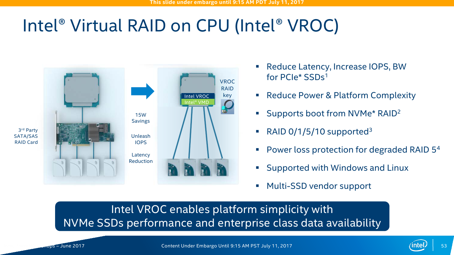 Ещё один компонент в Cascade Lake называется Virtual RAID on CPU (Intel VROC). Да, это встроенный RAID-контроллер, который поддерживает уровни 0/1/5/10 и возможность загрузки с массива (не во всех комбинациях, правда). Основная задача — увеличение скорости доступа и снижение задержки при обращении к NVMe-накопителям (посредством VMD тоже), плюс экономия электроэнергии путём отказа от внешнего контроллера. Детали строения опять-таки не приводятся, но говорится, что для работы VROC можно «отрезать» одно-два ядра CPU, которые и будут обслуживать массив. Явного ограничения на тип SSD (в том числе на марку) нет. Эта опция, скорее всего, будет необязательной и за неё придётся доплачивать.