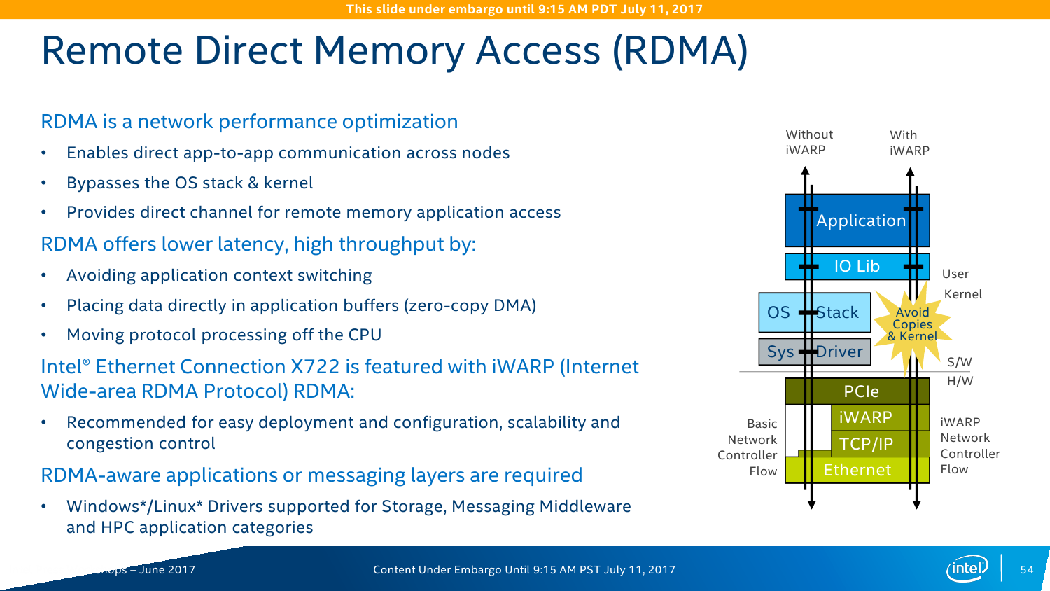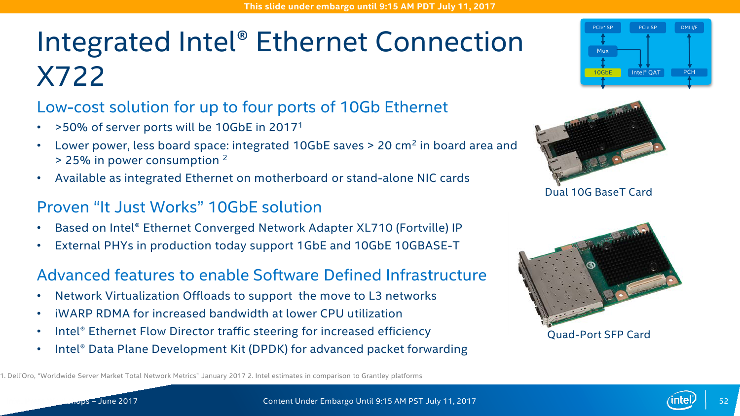 Конечно, самое важное изменение касается работы с Сетью. В C620 появился новый сетевой контроллер Intel X722, который предлагает до четырёх 10-гигабитных подключений. В чипсете находится только MAC-уровень, а конкретные физические порты выбираются уже производителем платы (пока есть только медь). X722 поддерживает различные варианты разгрузки (offload) для систем виртуализации, а также RDMA-протокол iWARP. Выбор последнего обусловлен, по словам Intel, тем, что для его использования не требуется дополнительных вложений в текущую сетевую инфраструктуру.