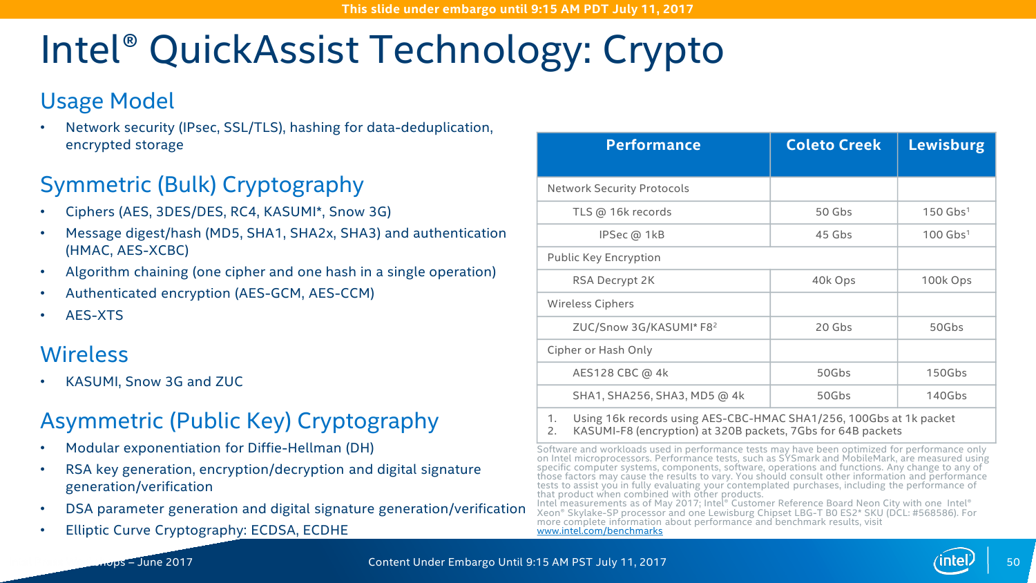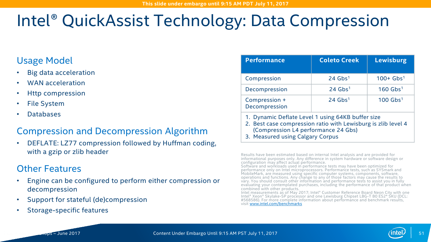 Intel QuickAssist Technology (QAT) — это ускоритель для работы с компрессией и криптографией. Аппаратно поддерживается целый набор алгоритмов шифрования и хеширования. Ранее он был доступен в виде отдельных чипов и плат, а теперь перебрался в чипсет. Разработчики обещают следующий уровень производительности: шифрование на лету AES-256 — до 150 Гбит/с; расшифровка ключами RSA-2048 – до 100 тысяч операций в секунду; одновременные сжатие и распаковка LZ77 — до 100 Гбит/с; обработка TLS и IPSec — до 150 и 100 Гбит/с соответственно. Но вообще говоря, QAT нужен не только и не столько для обработки сетевого трафика, потому что его возможности можно утилизировать и при работе с защищёнными приложениями, и с системами хранения данных, которые также получат прирост производительности за счёт разгрузки некоторых функций.