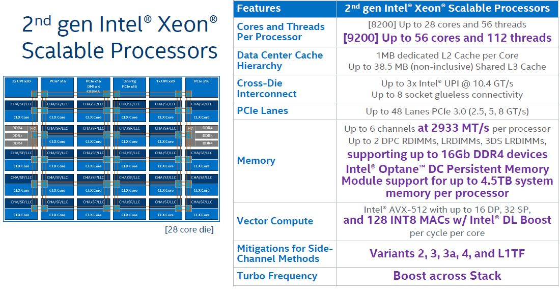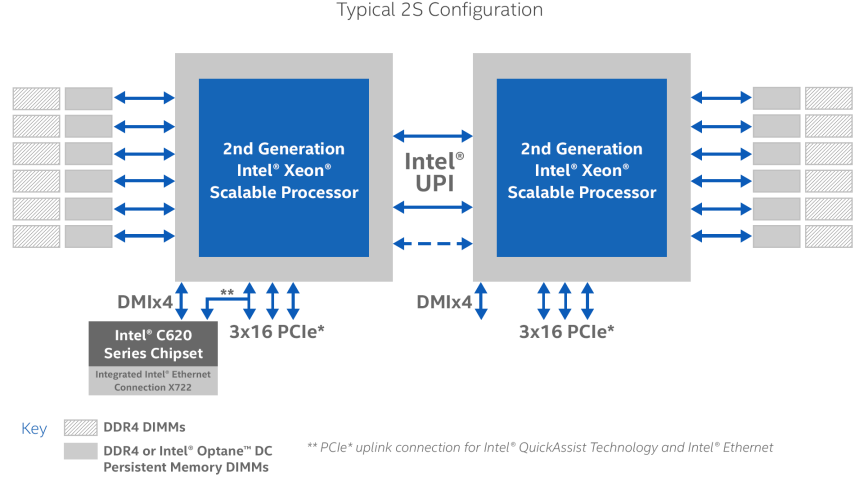 Intel Xeon Platinum позволяют объединить до 8 процессоров и имеют три линии шины UPI (о ней чуть позже), поддерживают память DDR4-2666, AVX-512 и возможность одновременного исполнения двух 512-бит FMA-инструкций. Xeon Gold 6xxx имеют всё то же самое, но позволяют объединить до 4 процессоров.