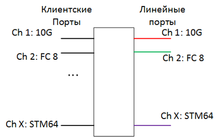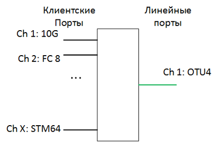 Кроме транспондеров WDM платформы позволяют устанавливать макспондеры. Макспондер позволяет низкоскоростные клиентские порты агрегировать в более скоростной линейный. Наиболее часто встречаемый вариант это передача 10G или 40G каналов через 100/200/400G линейный интерфейс.