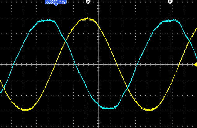 Осциллограммы электрических сигналов на входе и выходе ИБП (желтый - на входе в ИБП, синий на выходе ИБП)