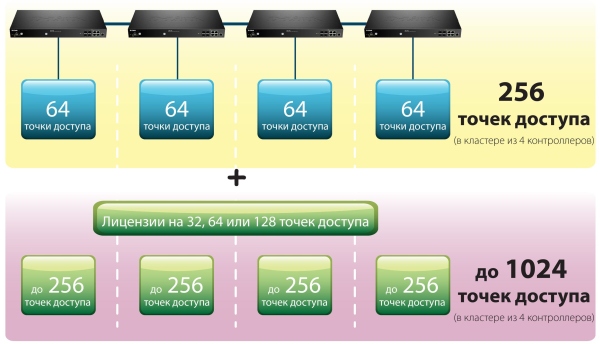 Масштабируемость, доступность, гибкость - Для удовлетворения постоянно меняющихся требований DWC-2000 предлагает гибкие функции: администратор может приобрести лицензию D-Link Business Wireless Plus для обновления функциональных возможностей устройства. Компания D-Link предлагает ряд обновлений лицензий DWC-2000 для увеличения количества управляемых точек доступа. По умолчанию беспроводной контроллер DWC-2000 поддерживает управление 64 точками доступа, но их число может быть увеличено до 256 ТД на контроллер. оддерживается