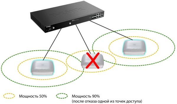 Благодаря периодически выполняемому сканированию радиочастотных каналов и анализу производительности DWC-2000 автоматически выбирает частотный план и регулирует мощность, чтобы избежать помех и обеспечить бесперебойную работу сети. Для того чтобы восполнить недостаточную зону покрытия в результате выхода из строя точки доступа, DWC-2000 автоматически увеличивает выходную мощность передатчика соседних точек доступа, чтобы увеличить их зону покрытия.
