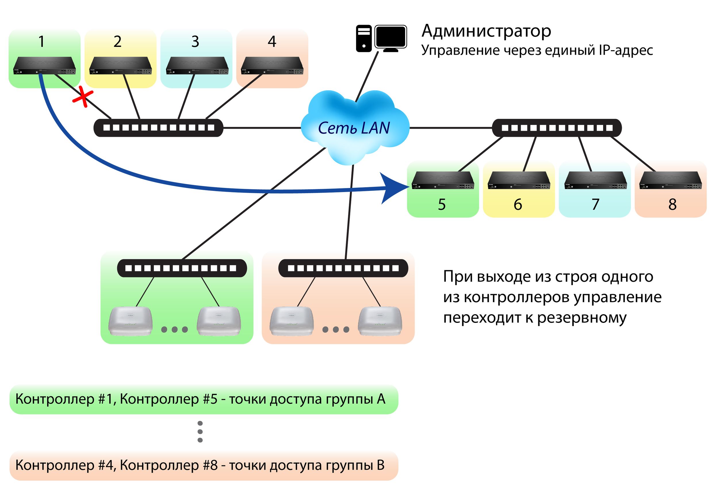 Надежная и оптимальная работа - сети DWС-2000 поддерживает функции самостоятельной оптимизации и восстановления, что обеспечивает бесперебойную работу беспроводной сети. Метод максимального резервирования беспроводных контроллеров 4+4 и механизм AP provisioning позволяют автоматически переключать управление ТД с вышедшего из строя контроллера на резервный, обеспечивая надежность сети.