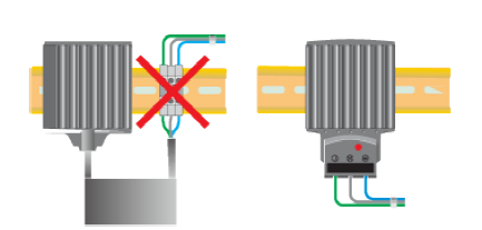 Нагревательный элемент – позистор, ограничивающий максимальную температуру, но не исключающий использование терморегулятора. Нагреватель устанавливается на DIN-рейку 35 мм. Подсоединяется трехполюсным зажимом. Предусмотрено использование гибких проводов с наконечниками от 0,5 до 1,5 мм, жестких проводов от 0,5 до 2,5 мм. Температура эксплуатации и хранения от -45 до +70°C.